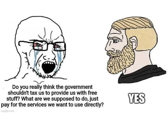 I'm also expecting the state to do infrastructure, like laying internet cables or water pipes to where people live, even if it is remote. It's fine to use tax money for that. But once it's done, reduce the taxes again.