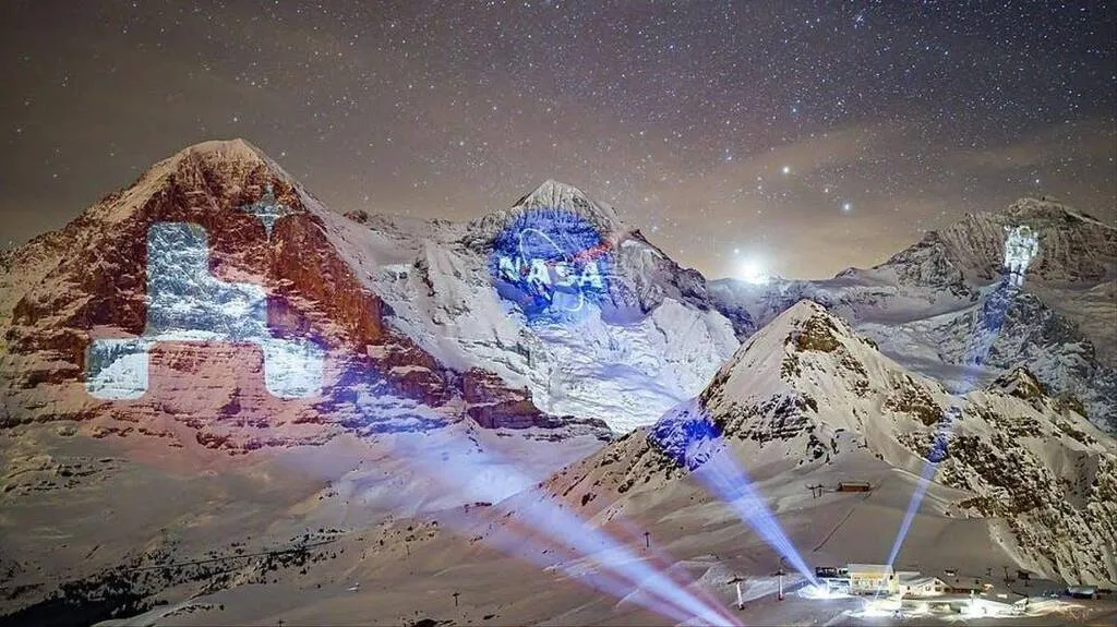 A giant projection of the NASA Mars 2020 mission logo on the north face of the Eiger mountain (left), NASA logo on the Monch mountain (center) and and astronaut on the Jungfrau mountain (right), by Swiss light artist Gerry Hofstetter, is pictured from the alpine resort of Mannlichen, Switzerland, Sunday, February 14, 2021. Several projections were performed both from the ground and helicopter and were carried out over distances of up to 8km and dimensions up to 2.2km in height on the iconic Swiss mountains Eiger, Monch und Jungfrau. The artistic performance pays tribute to the "Mars 2020" Perseverance rover mars mission by the NASA planned for landing on February 18, 2021 - Valentin Flauraud/Keystone via AP